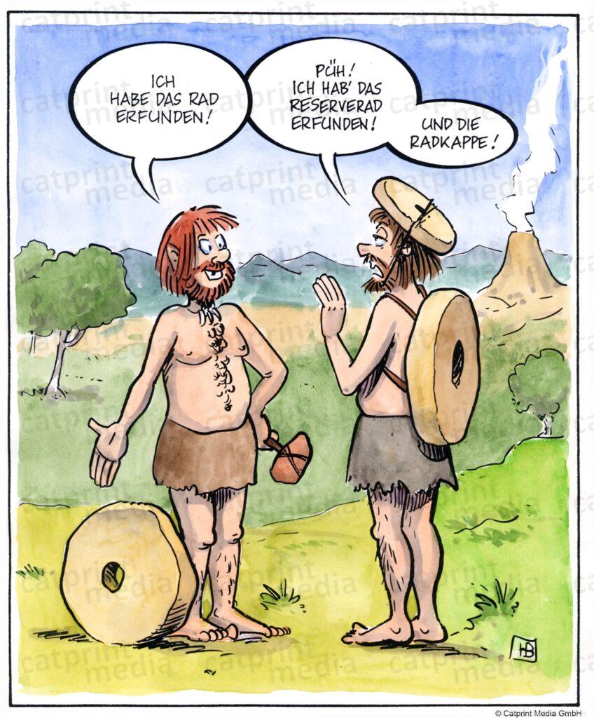 Zwei Männer, aus der Steinzeit, unterhalten sich über ihre neuesten Erfindungen. Der eine von ihnen, der das Rad erfunden hat, hat ein Rad aus Stein neben sich stehen. Der andere, der das Reserverad und die Radkappe erfunden hat, trägt ein Rad auf dem Rüc