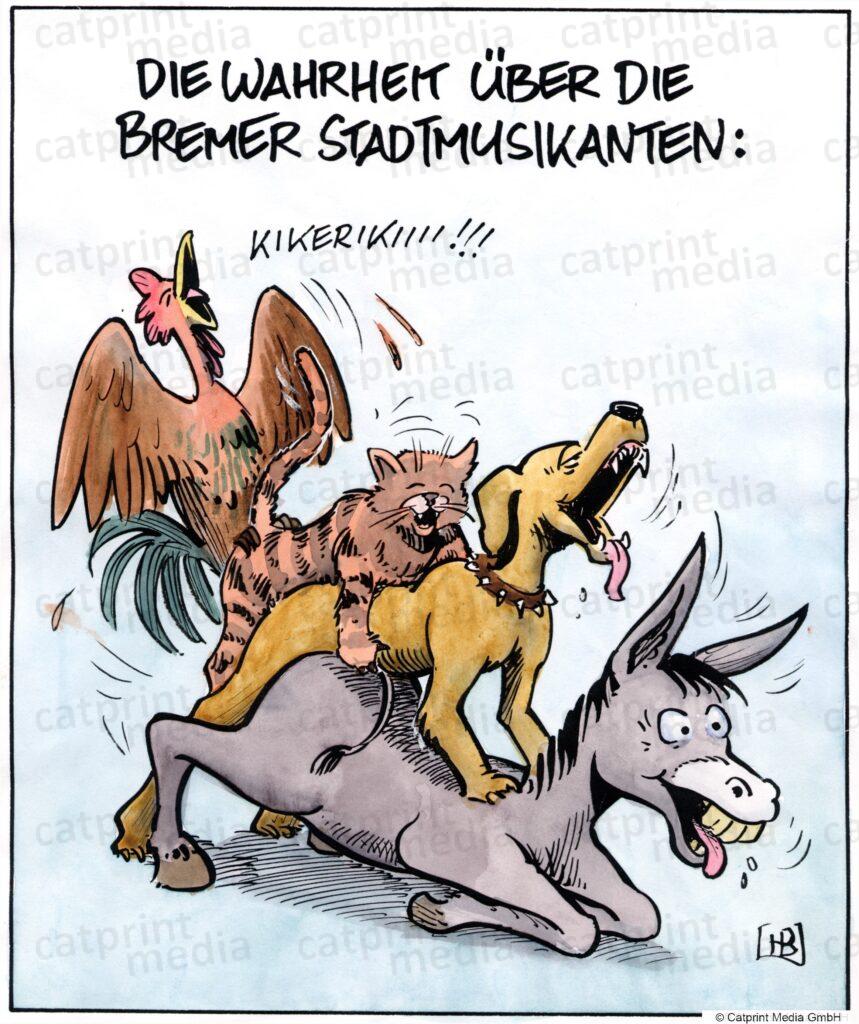 Künstler: Harm Bengen Artikelnummer: 12-6593 Kategorien: Geschichte, Liebe, Sex, Tiere Schlagwörter: Hund, Bremer, Stadtmusikanten, Hahn, Esel, Katze