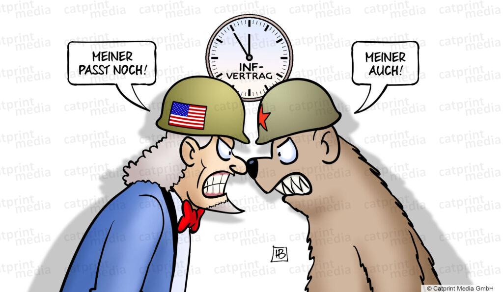 Künstler: Harm Bengen Artikelnummer: 12-33886 Kategorie: Politik Schlagwörter: Bär, usa, Krieg, Russland, vertrag, Raketen, Uncle, Sam, Abrüstung, Wettruesten, INF, Stahlhelme